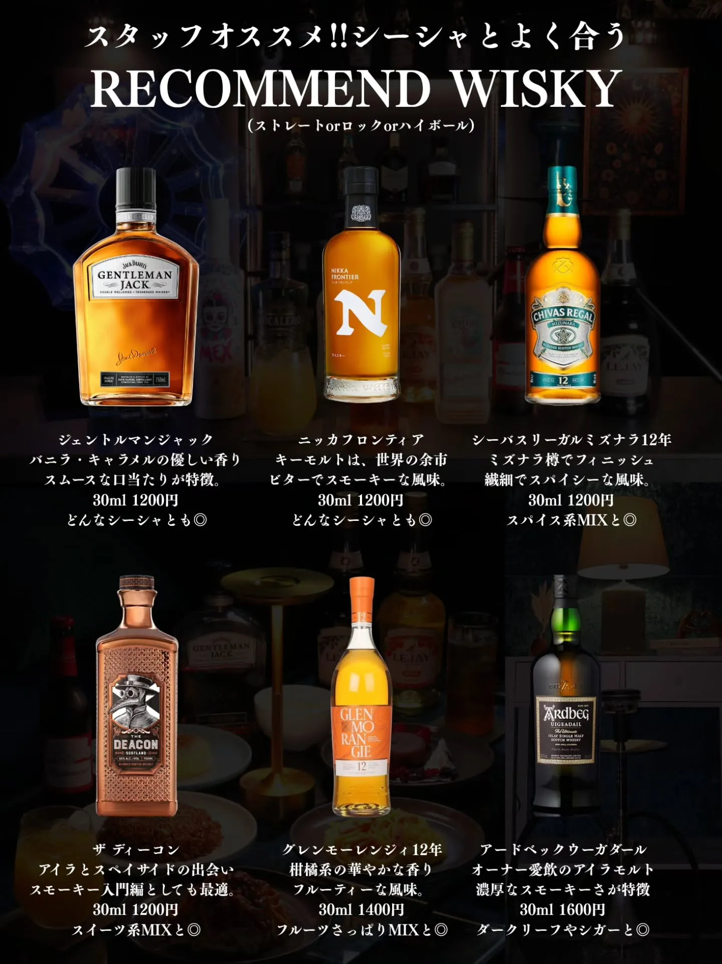 スタッフオススメ!! 2026/04/03 スタッフオススメ!! シーシャに合うウイスキーを集めました! 各ウイスキーの特徴やどんなフレーバーに合うかも バッチリまとめております! ぜひぜひ美味しいシーシャと美味しいウイスキーで 特別な時間をお過ごしください!!